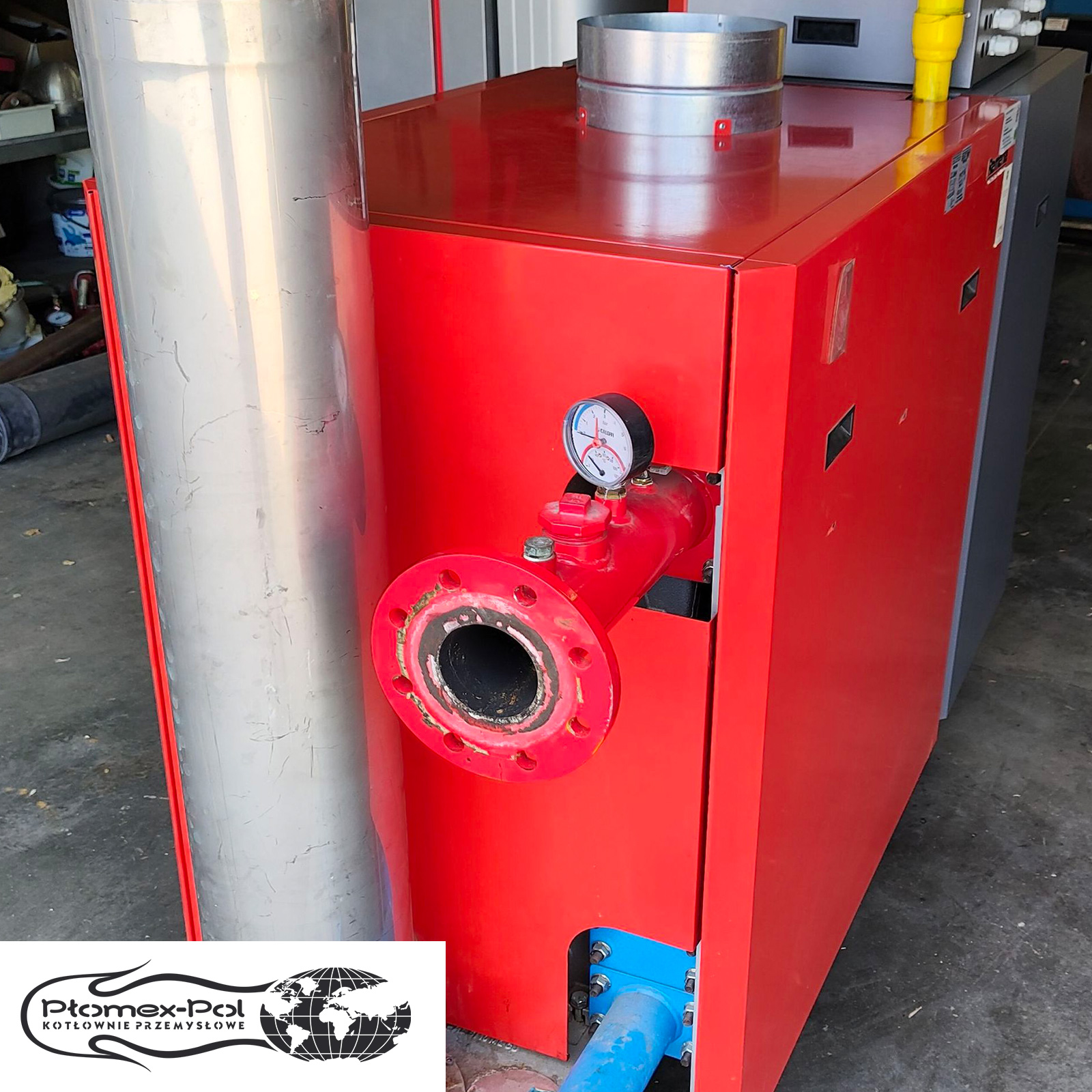 Kocioł Remeha Gas 310 (460 kW), komin oraz elementy widoczne na zdjęciach.